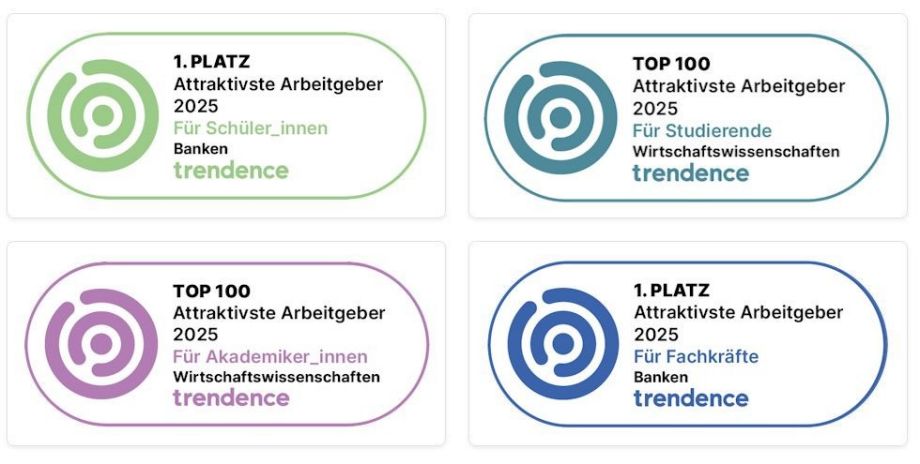 Dass das nicht nur so daher gesagt ist, zeigt auch das trendence-Ranking, in dem wir 2024 wieder auf Platz 1 der attraktivsten Arbeitger für Schülerinnen, Schüler und Fachkräfte im Bereich Banken stehen. Auch für Studierende und Akademikerinnen und Akademiker im Bereich Wirtschaftswissenschaften sind wir einer der Top 100 attraktivsten Arbeitgeber.