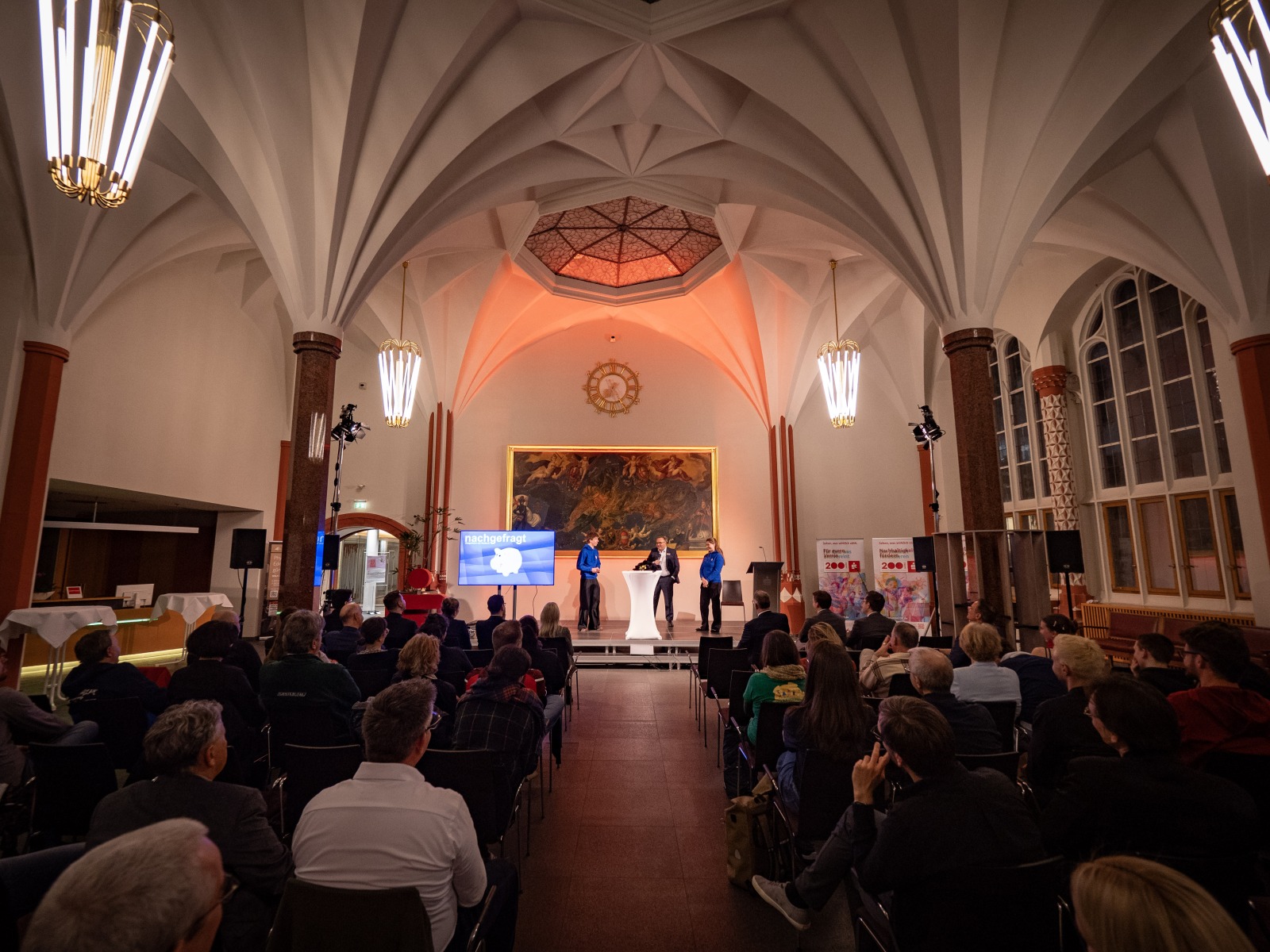 Für einen lebendigen Abschluss des offiziellen Programms sorgte das Schülerinterview im Format „nachgefragt“: Schülerin Tilia und Schüler Jakob vom Rotteck-Gymnasium Freiburg befragten Vorstandsvorsitzenden Daniel Zeiler – locker, neugierig und auf Augenhöhe. Das seit 2005 bestehende Gesprächsformat hat schon Persönlichkeiten wie SC-Trainer Julian Schuster und Unternehmer Fritz Keller zu Gast gehabt. Im Anschluss nutzten Gäste und Sparkassen-Vertreterinnen und -Vertreter die Gelegenheit zum persönlichen Austausch.